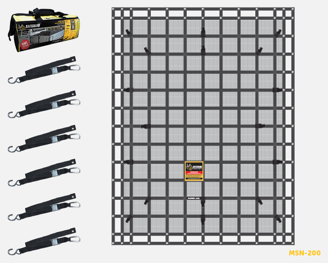 The Safeguard MSN-200 is our all-around net, it’s a universal size of 2600mm x 2000mm but still, load-rated to the 1000kg rating. It will do all trailers up to 8ft as well as both Dual, space/extra and Single Cab Trays. It has eyelets around the perimeter and 18 tabs over the net. It comes with 6 x 1m straps and comes in a heavy-duty carry bag.